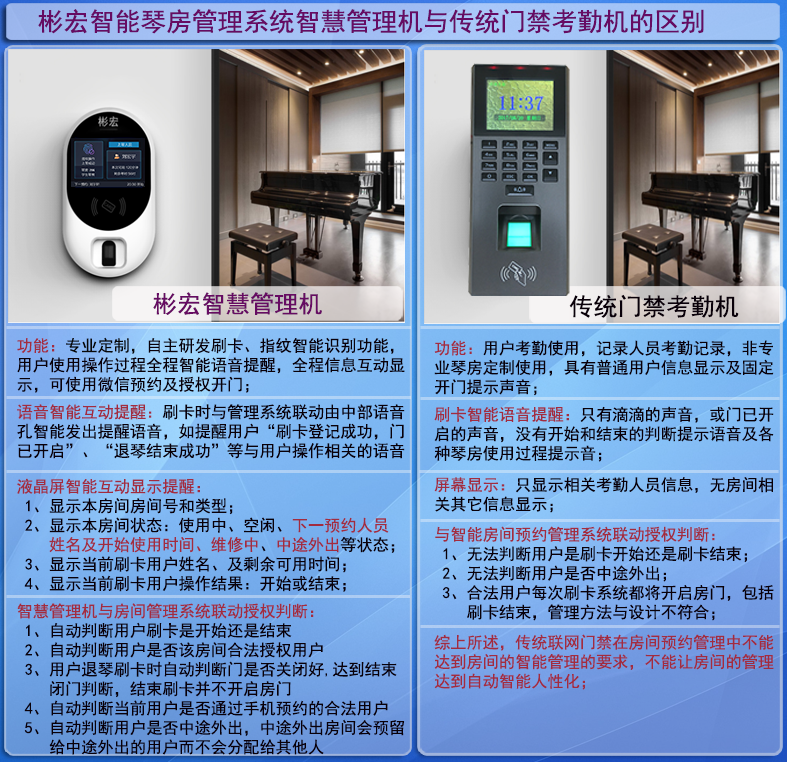 ▲彬宏琴房智慧管理机与传统门禁考勤机功能对比