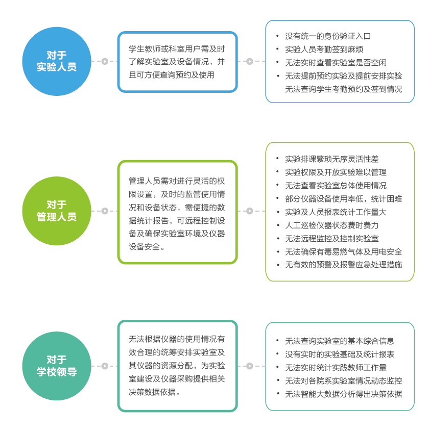 传统的实验室管理无法做到统一服务窗口与身份认证登陆入口,无法处理校级所有实验室的流程管理及数据的汇总、分析与展示,无法智能的管控实验室及实验设备,无法自动汇总系统真实的使用数据,不能智能分析数据,为实验室建设做出有效的决策依据。