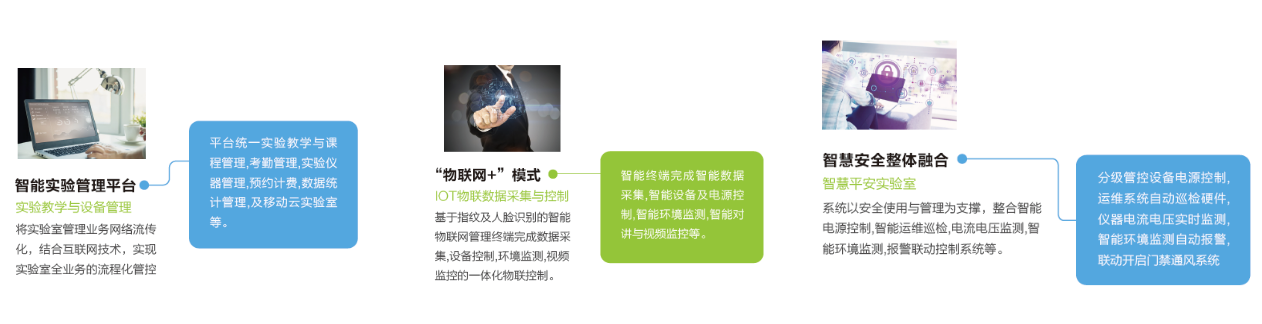 系统将面向实验人员、管理人员、资产处、教务处、实训中心等实验室的功能模块智能化统一数据及操作管理。通过将实验室仪器,数据采集终端,电源控制终端、环境监测终端,自动巡检终端、视频监控对讲等智能融合为移动物联网及互联网智慧管理平台融为一体。
